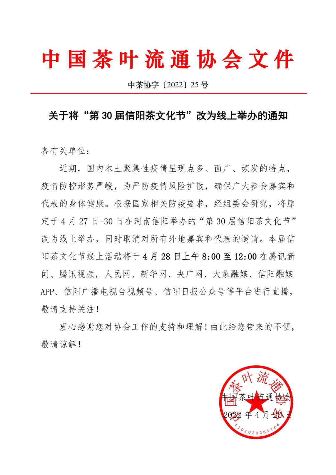 关于将“第30届信阳茶文化节”改为线上举办的通知