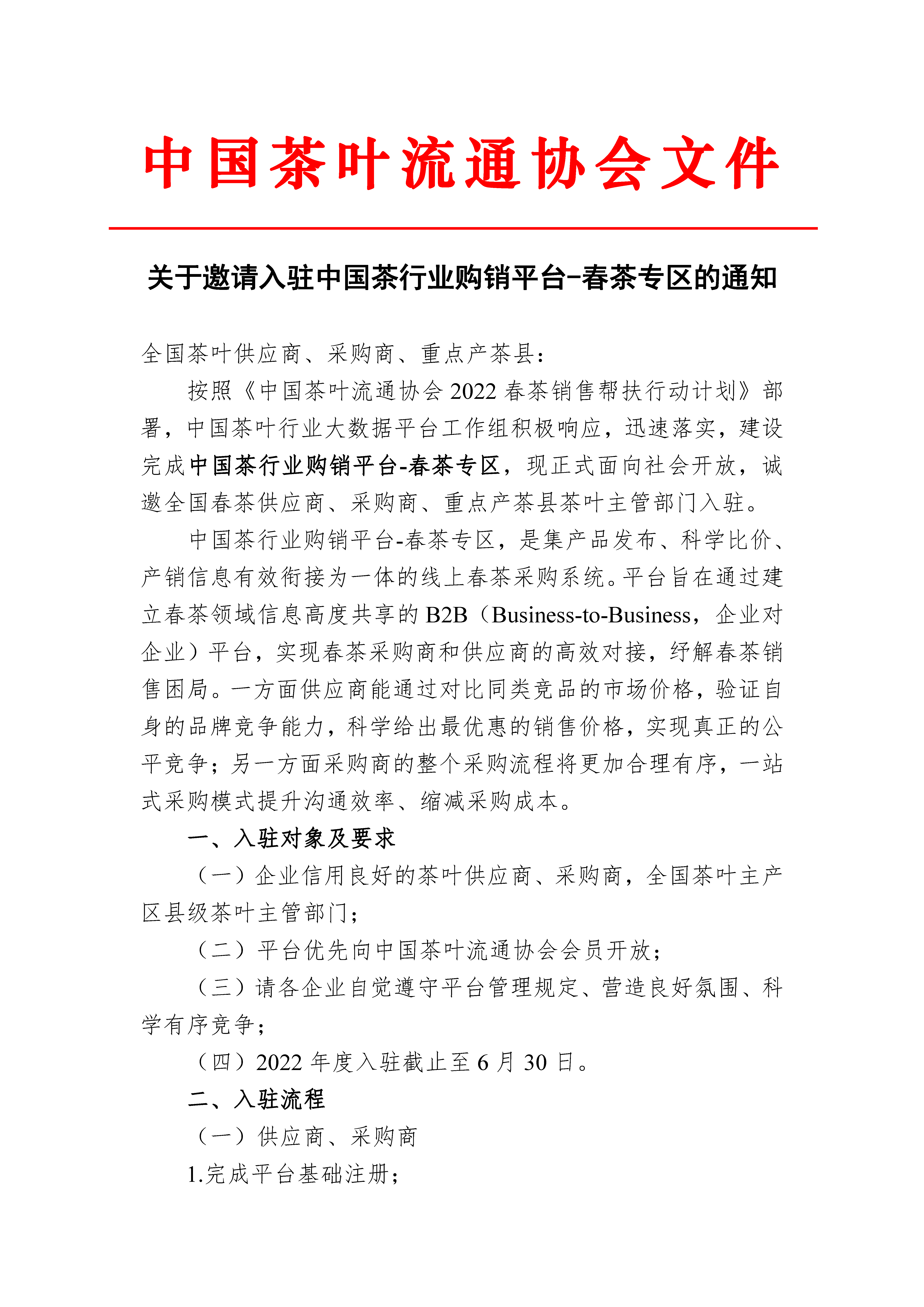 关于邀请入驻中国茶行业购销平台-春茶专区的通知