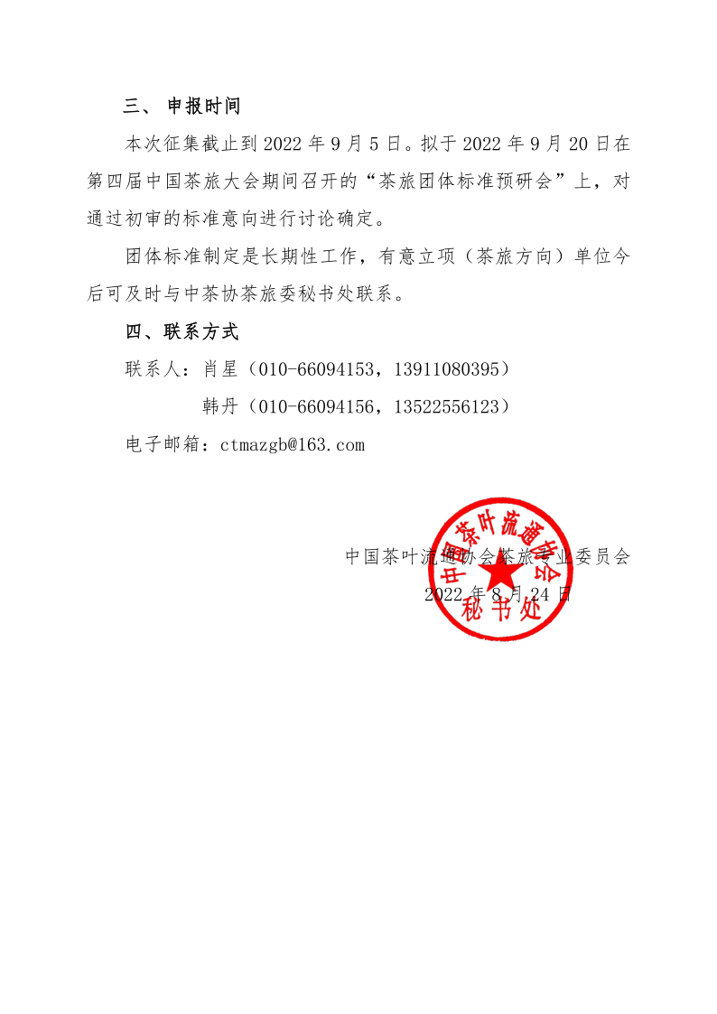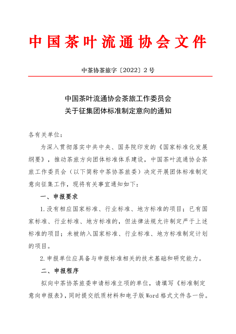 中国茶叶流通协会茶旅工作委员会关于征集团体标准制定意向的通知