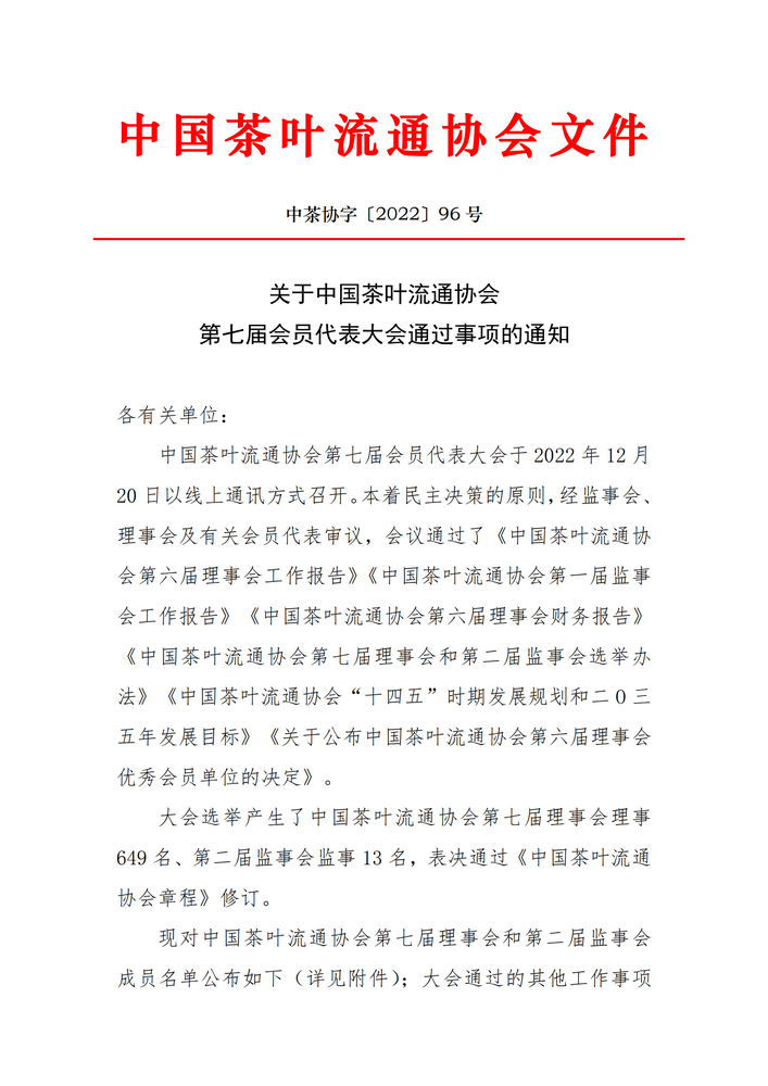 关于中国茶叶流通协会第七届会员代表大会通过事项的通知