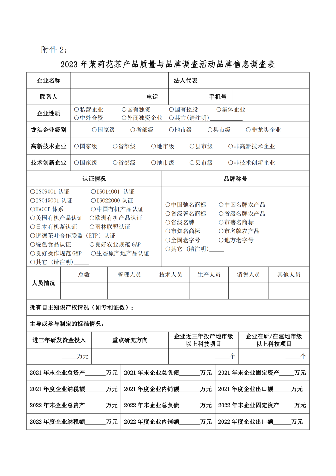附件2:2023年茉莉花茶产品质量与品牌调查活动品牌信息调查表