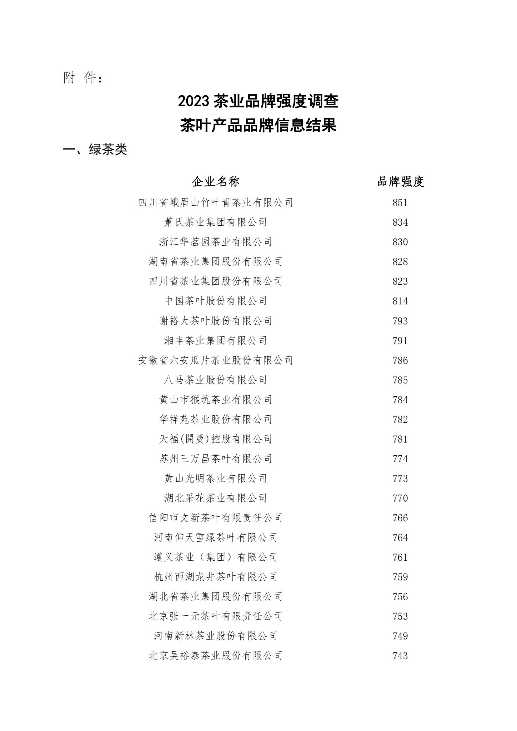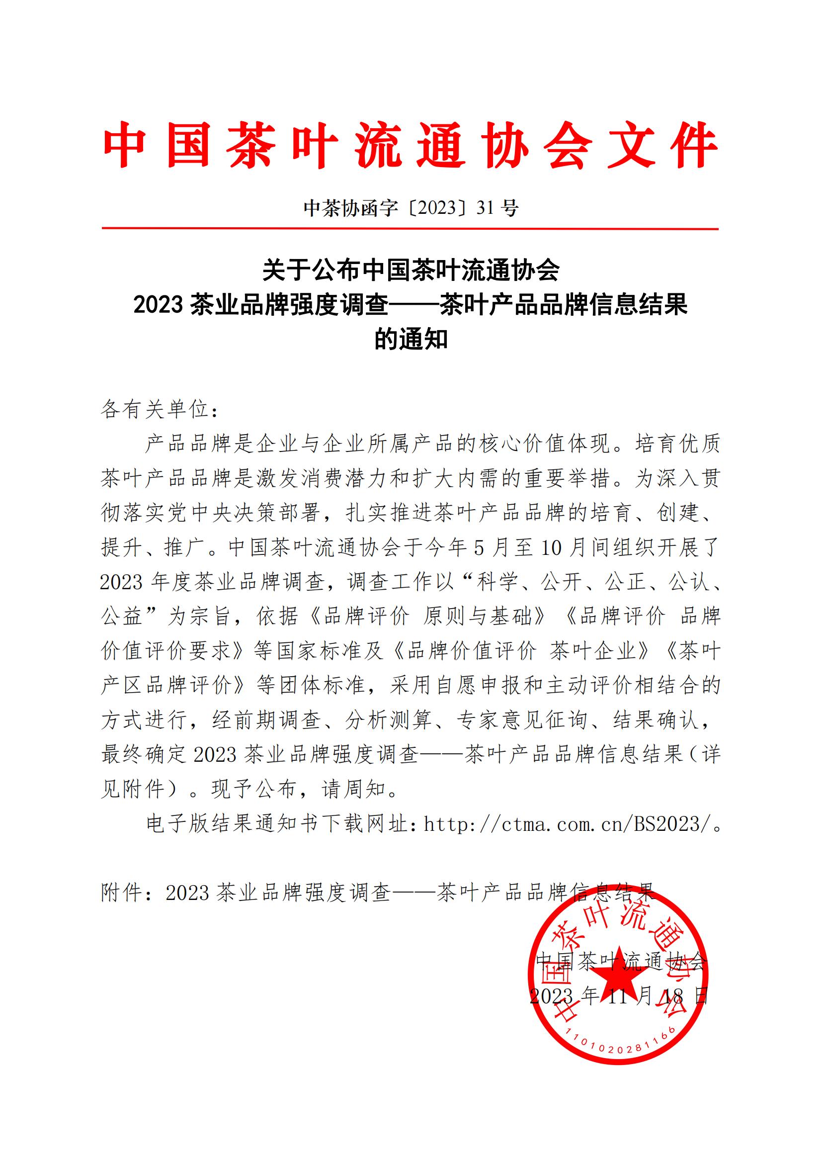 关于公布中国茶叶流通协会2023茶业品牌强度调查——茶叶产品品牌信息结果的通知