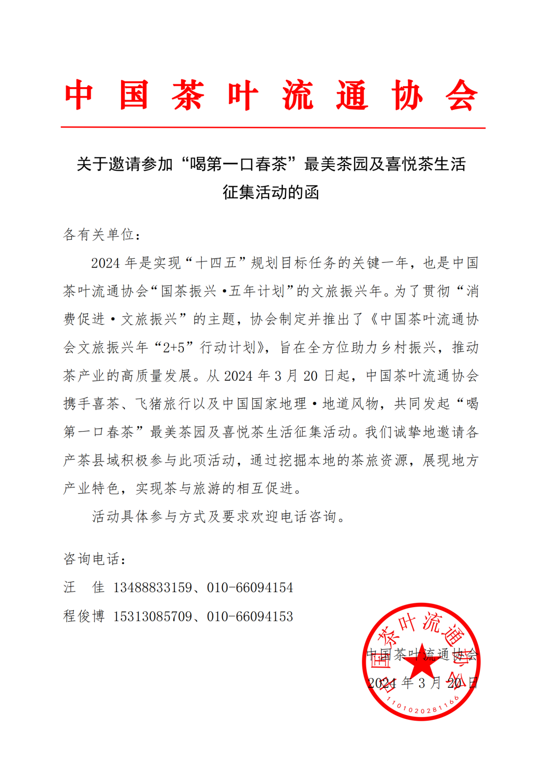关于邀请参加“喝第一口春茶”最美茶园及喜悦茶生活征集活动的函