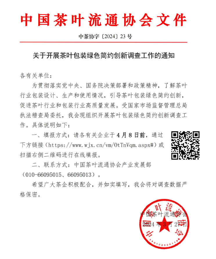 为贯彻落实党中央、国务院决策部署和政策精神,了解茶叶行业包装设计、生产和使用情况,引导茶叶包装绿色简约创新,促进茶叶行业和包装行业高质量发展。受国家市场监督管理总局执法稽查局委托,我会现组织开展茶叶包装绿色简约创新调查工作。具体说明如下: