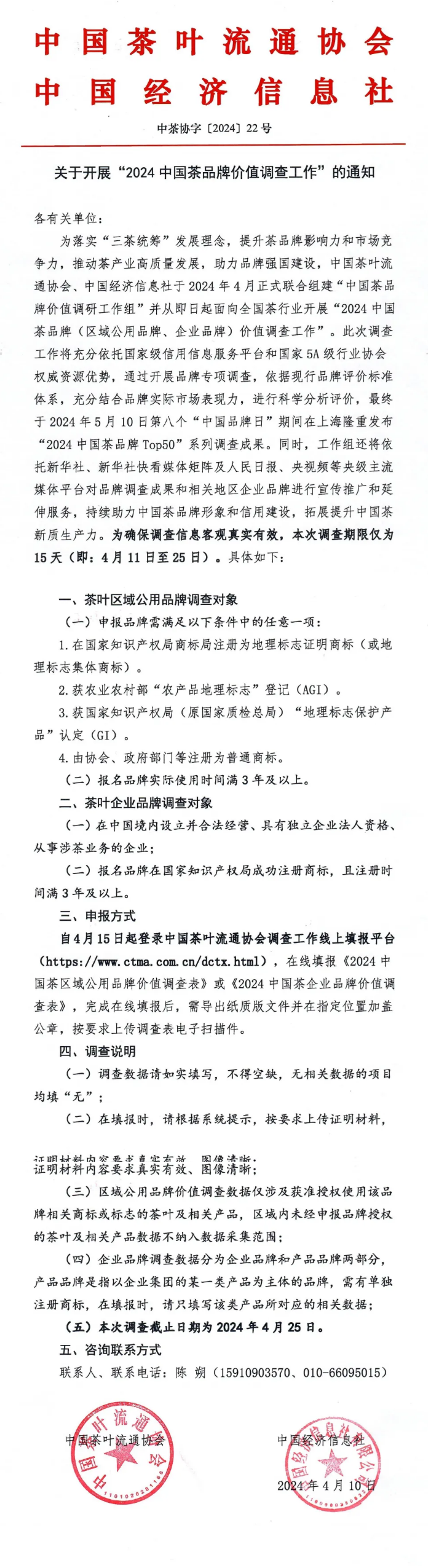 为落实“三茶统筹”发展理念,提升茶品牌影响力和市场竞争力,推动茶产业高质量发展,助力品牌强国建设,中国茶叶流通协会、中国经济信息社于2024年4月正式联合组建“中国茶品牌价值调研工作组”并从即日起面向全国茶行业开展“2024中国茶品牌(区域公用品牌、企业品牌)价值调查工作”。此次调查工作将充分依托国家级信用信息服务平台和国家5A级行业协会权威资源优势,通过开展品牌专项调查,依据现行品牌评价标准体系,充分结合品牌实际市场表现力,进行科学分析评价,最终于2024年5月10日第八个“中国品牌日”期间在上海隆重发布“2024中国茶品牌Top50”系列调查成果。同时,工作组还将依托新华社、新华社快看媒体矩阵及人民日报、央视频等央级主流媒体平台对品牌调查成果和相关地区企业品牌进行宣传推广和延伸服务,持续助力中国茶品牌形象和信用建设,拓展提升中国茶新质生产力。为确保调查信息客观真实有效,本次调查期限仅为15天(即:4月11日至25日)。具体如下: