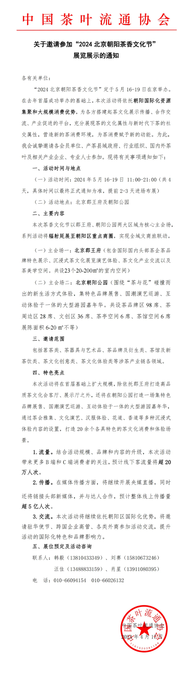 关于邀请参加“2024北京朝阳茶香文化节”的通知