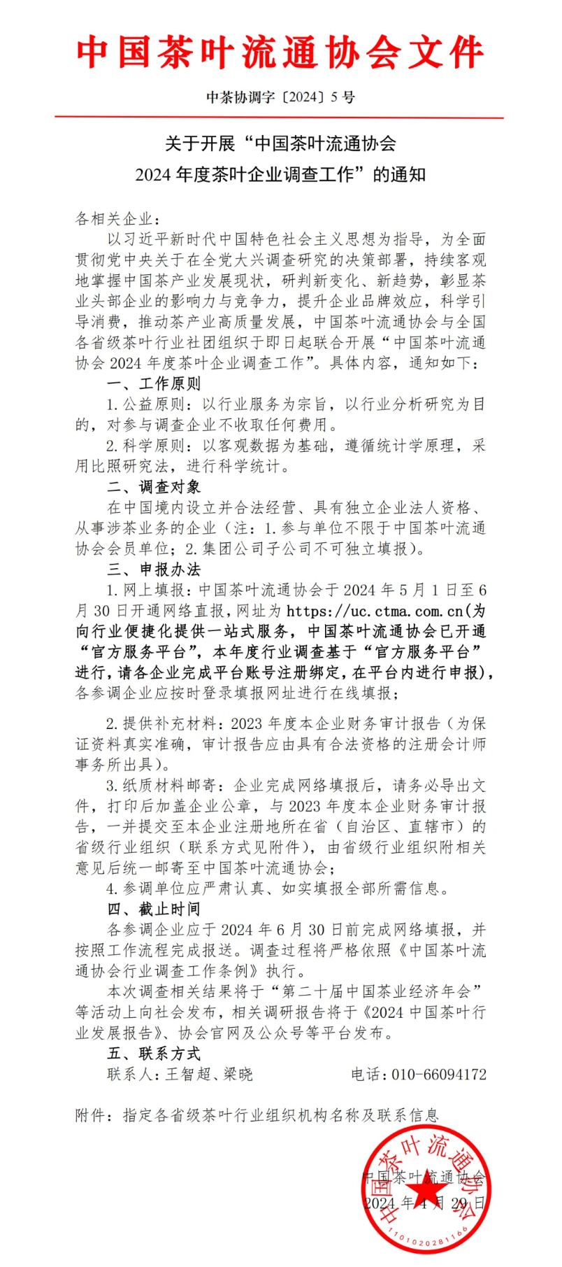 关于开展“中国茶叶流通协会2024年度茶叶企业调查工作”的通知