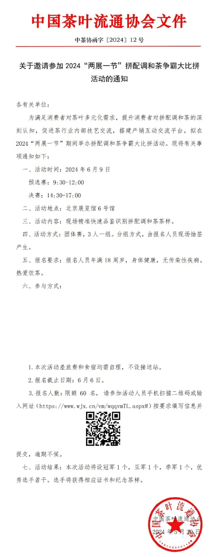 为满足消费者对茶叶多元化需求,提升消费者对拼配调和茶的深刻认知,促进茶行业内部技艺交流,搭建产销互动交流平台。拟在 2024“两展一节”期间举办拼配调和茶争霸大比拼活动。现将有关事项通知如下: