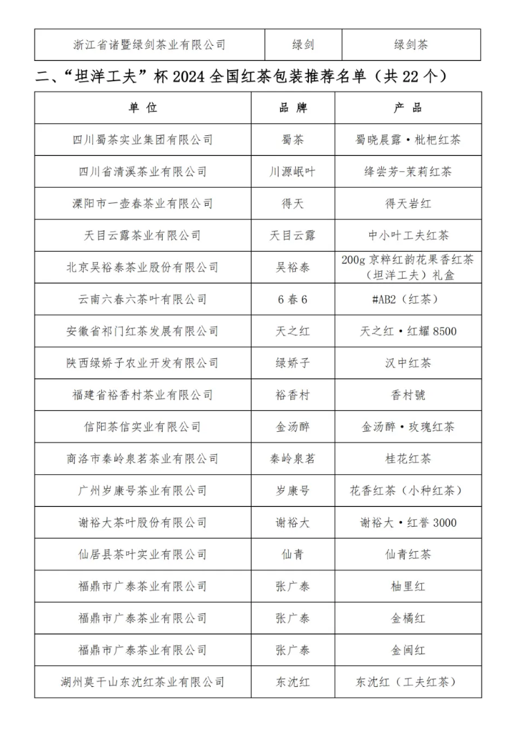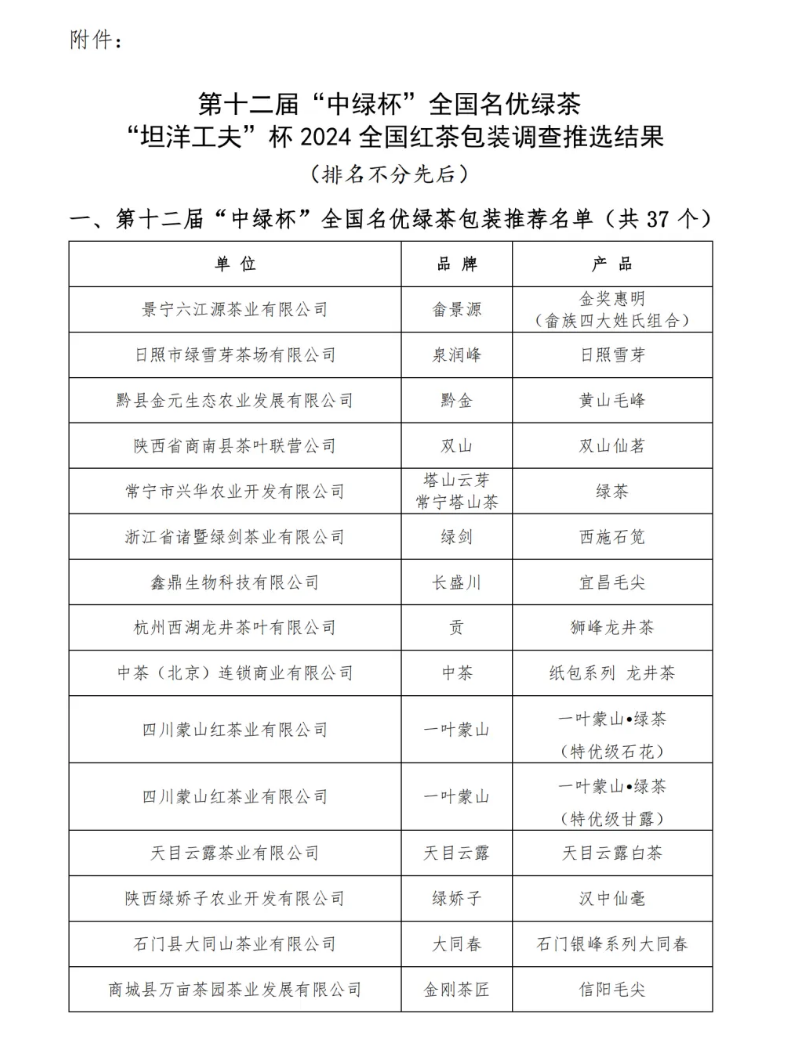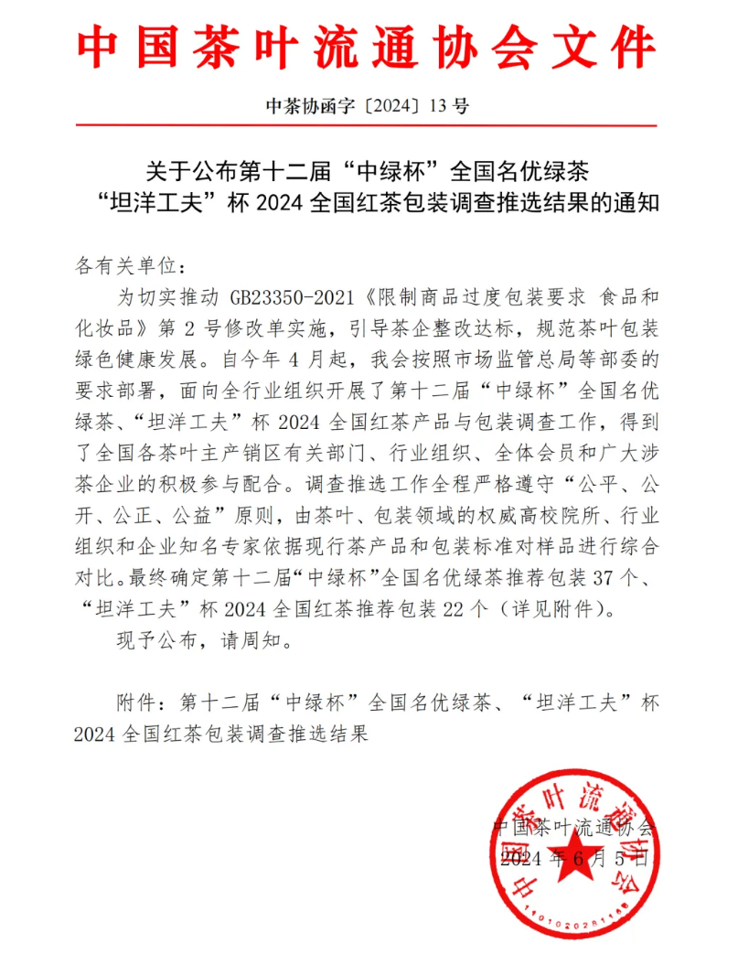 关于公布第十二届“中绿杯”全国名优绿茶“、“坦洋工夫”杯 2024 全国红茶包装调查推选结果的通知