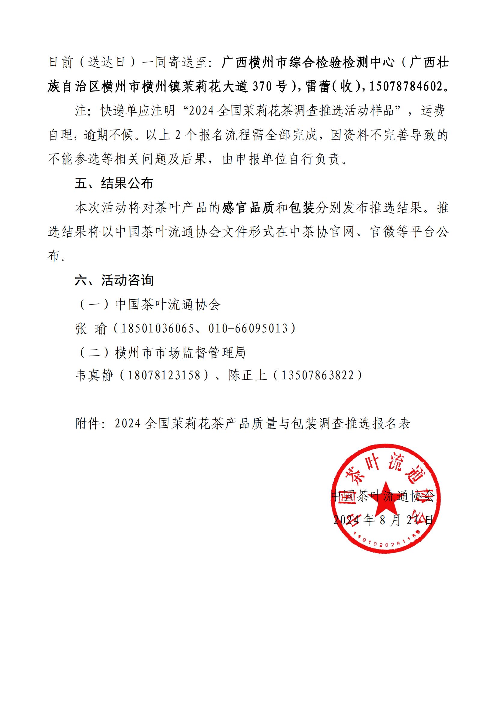 注:快递单应注明“2024全国茉莉花茶调查推选活动样品”,运费自理,逾期不候。以上2个报名流程需全部完成,因资料不完善导致的不能参选等相关问题及后果,由申报单位自行负责。