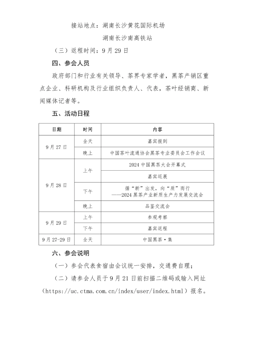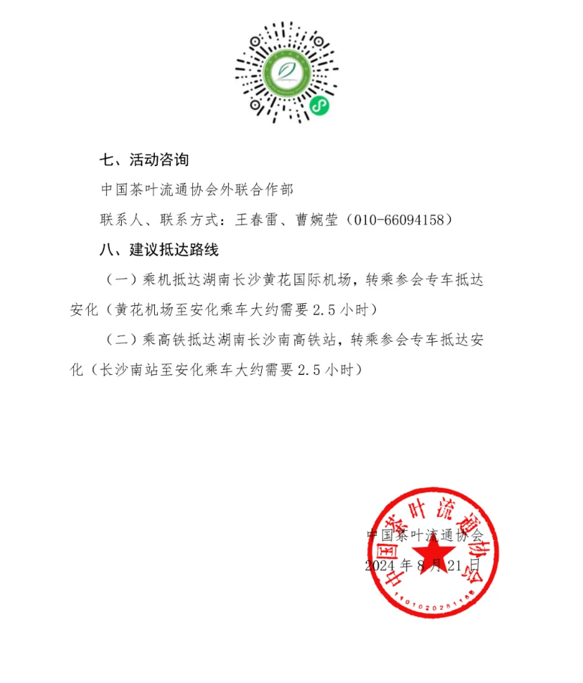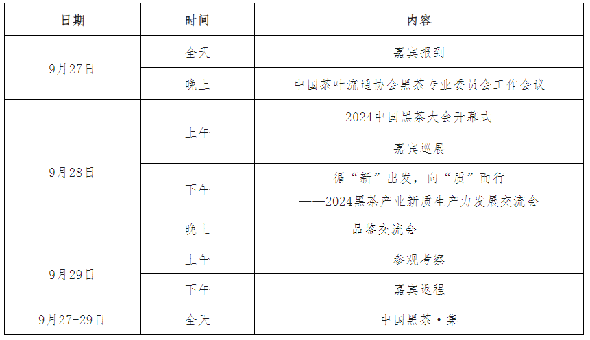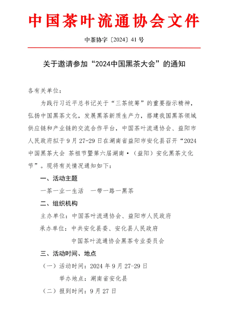 为践行习近平总书记关于“三茶统筹”的重要指示精神,弘扬中国黑茶文化,发展黑茶新质生产力,搭建我国黑茶领域供应链和产业链的交流合作平台,中国茶叶流通协会、益阳市人民政府拟于9月27-29日在湖南省益阳市安化县召开“2024中国黑茶大会 茶祖节暨第六届湖南·(益阳)安化黑茶文化节”。现将有关情况通知如下: