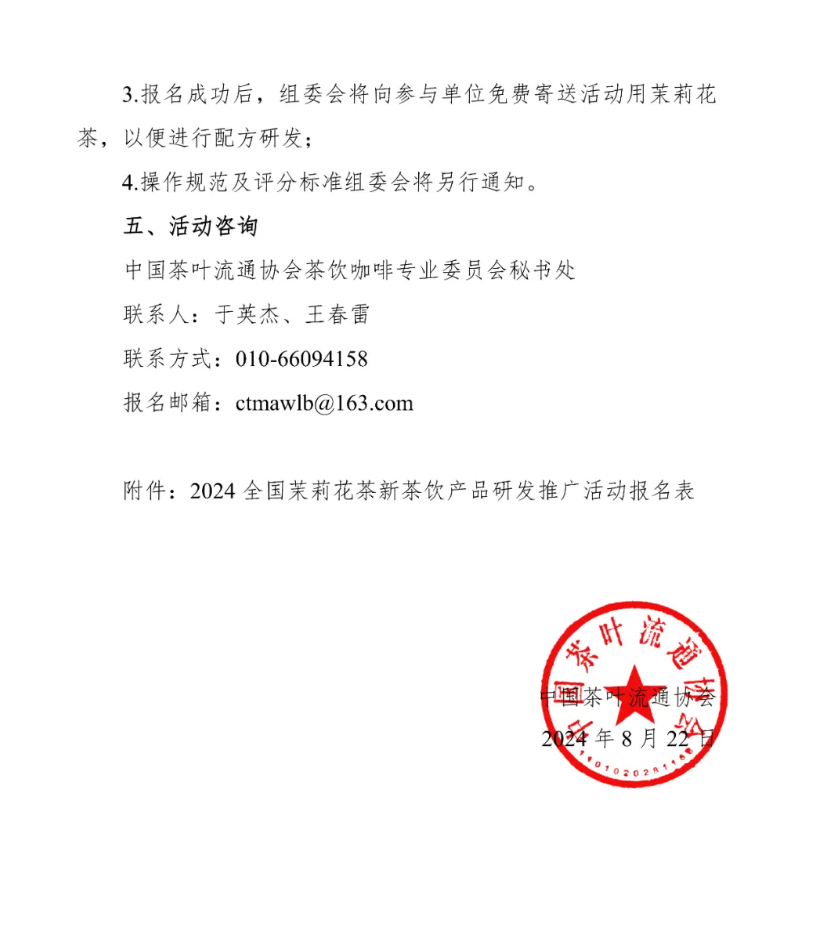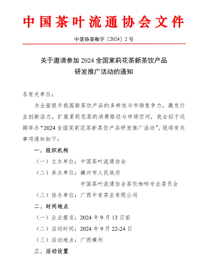 为全面提升我国新茶饮产品的多样性与市场竞争力,激发行业创新活力,扩展茉莉花茶的消费路径与市场空间,我会拟于近期举办“2024全国茉莉花茶新茶饮产品研发推广活动”,现将有关事项通知如下: