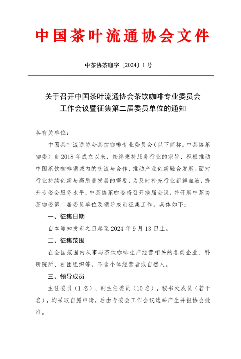 中国茶叶流通协会茶饮咖啡专业委员会(以下简称:中茶协茶咖委)自2018年成立以来,始终秉持服务行业的宗旨,积极推动中国茶饮咖啡领域内的交流与合作,推动产业创新融合发展。面对行业持续创新与高质量发展的需要,为及时补充行业新鲜血液,提升专委会服务水平,中茶协茶咖委将召开换届会议,并开展中茶协茶咖委第二届委员单位及领导成员征集工作。具体如下: