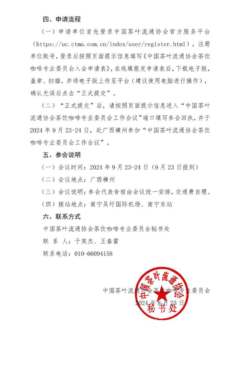 (一)申请单位首先登录中国茶叶流通协会官方服务平台(https://uc.ctma.com.cn/index/user/register.html),注册单位账号,登录后按照页面提示信息填写《中国茶叶流通协会茶饮咖啡专业委员会入会申请表》,在线填报完申请表后,下载电子版,盖章、扫描,并将电子版上传至平台(建议使用电脑进行操作),确认无误后点击“正式提交”。