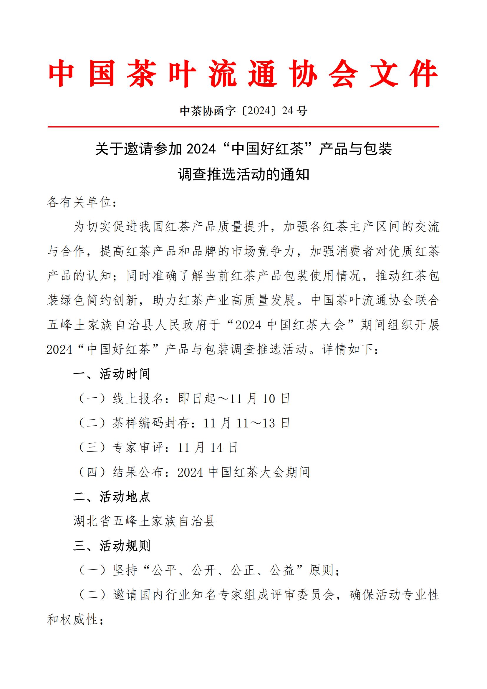(二)推选结果将在“2024中国红茶大会”期间以中国茶叶流通协会文件形式公布,并在活动现场进行宣传、展示;