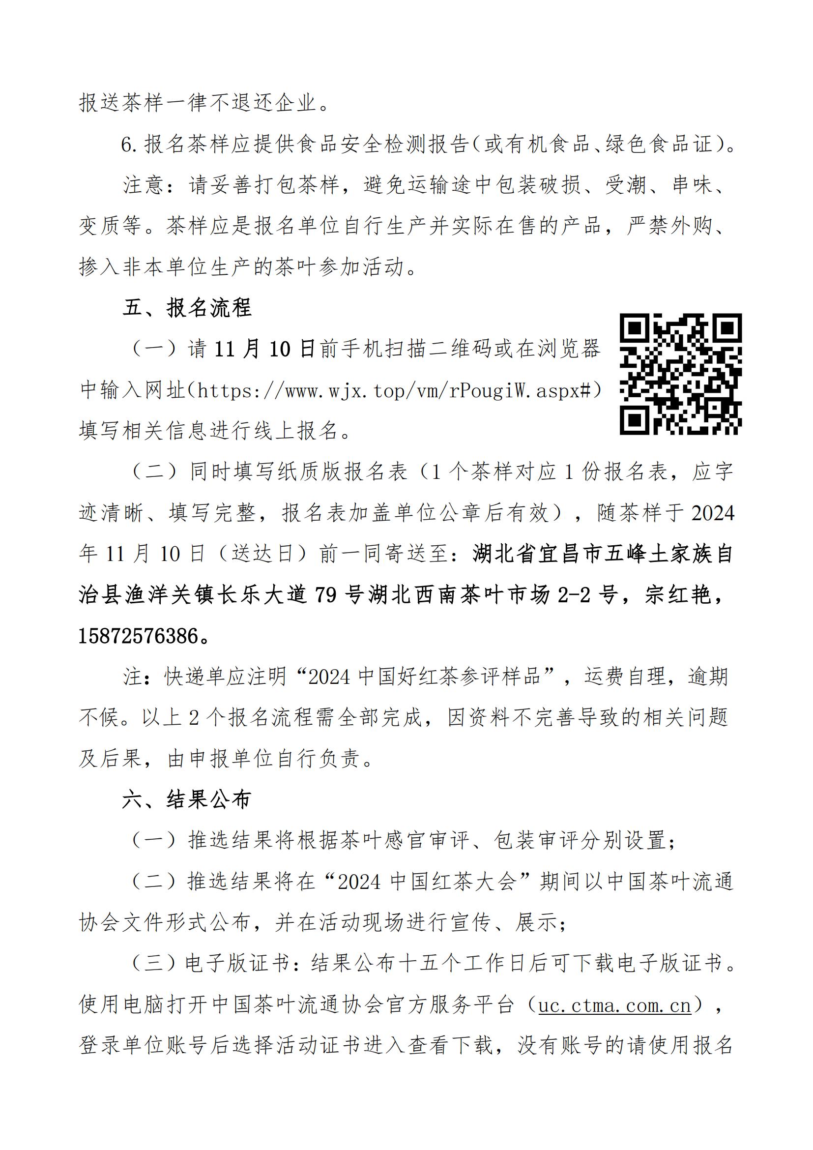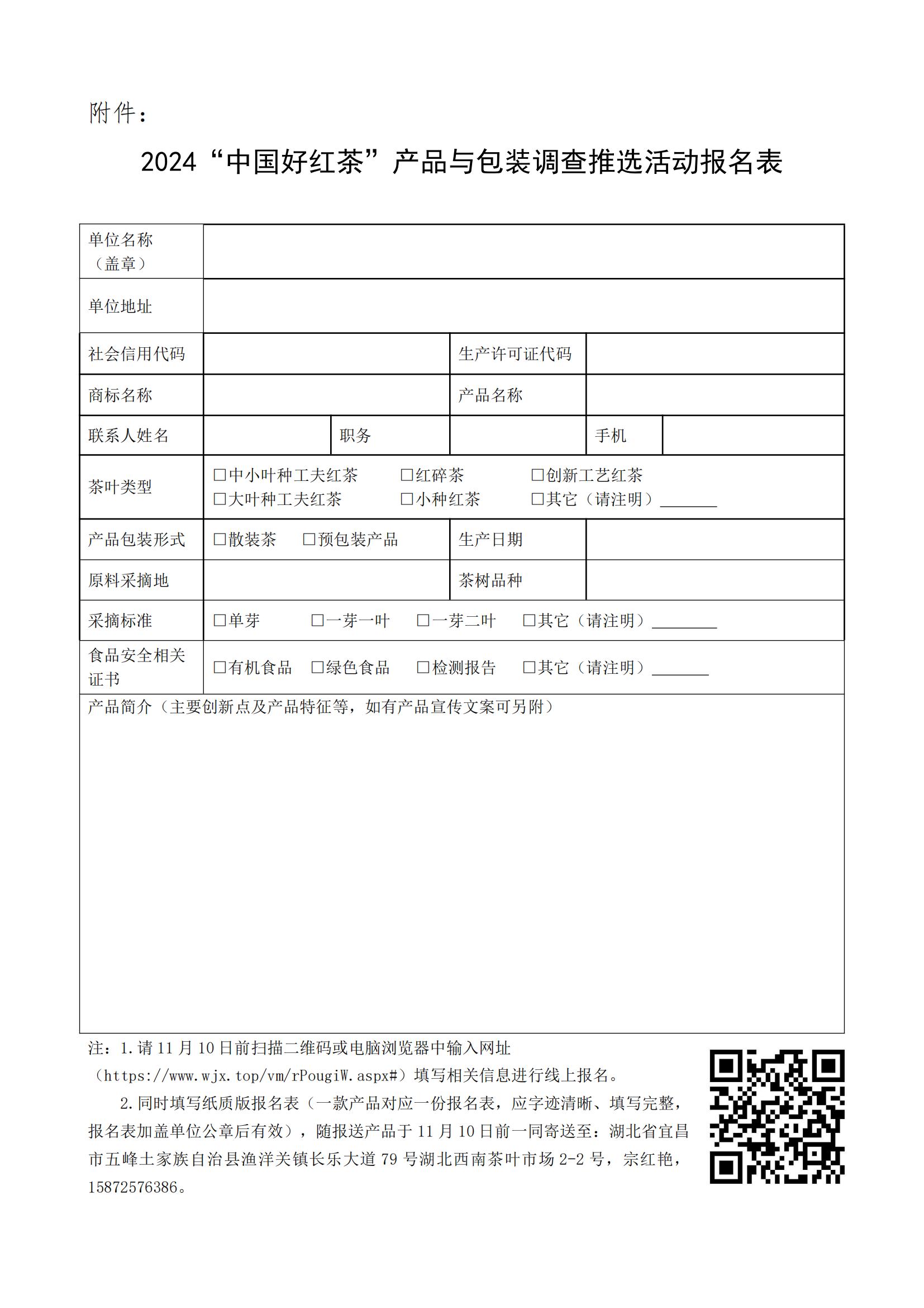 (二)同时填写纸质版报名表(1个茶样对应1份报名表,应字迹清晰、填写完整,报名表加盖单位公章后有效),随茶样于2024年11月10日(送达日)前一同寄送至:湖北省宜昌市五峰土家族自治县渔洋关镇长乐大道79号湖北西南茶叶市场2-2号,宗红艳,15872576386。