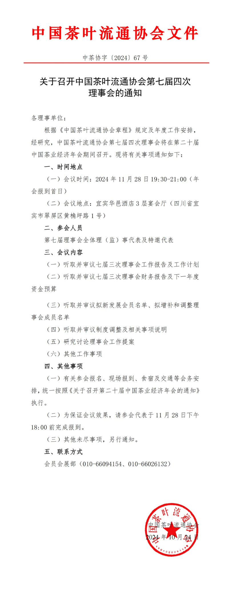 关于召开中国茶叶流通协会第七届四次理事会的通知