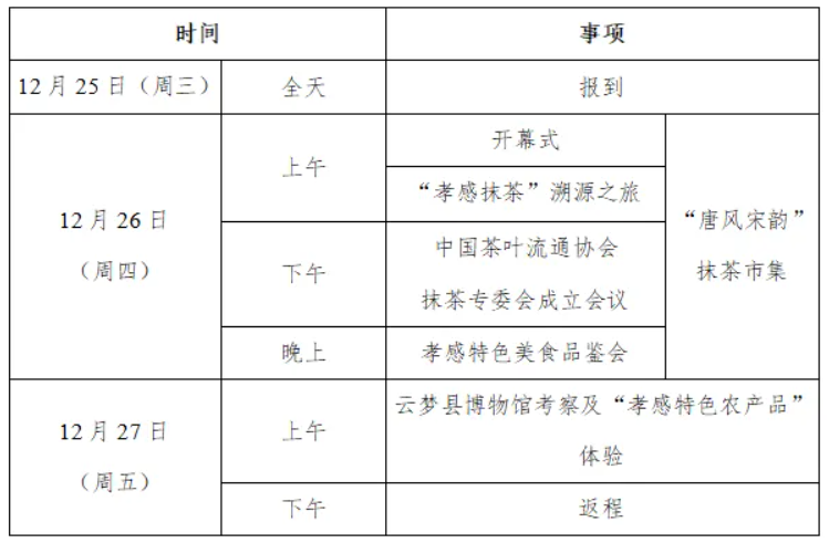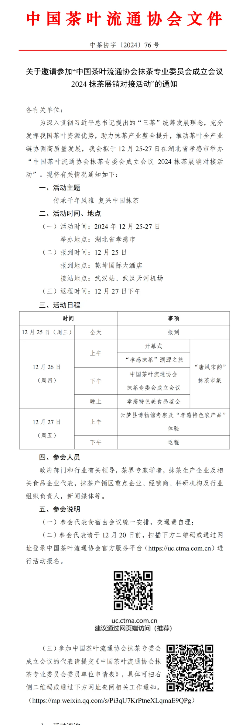 为深入贯彻习近平总书记提出的“三茶”统筹发展理念,充分发挥我国茶叶资源优势,助力抹茶产业整合提升,推动茶叶全产业链协调高质量发展,我会拟于12月25-27日在湖北省孝感市举办“中国茶叶流通协会抹茶专委会成立会议 2024抹茶展销对接活动”。现将有关情况通知如下: