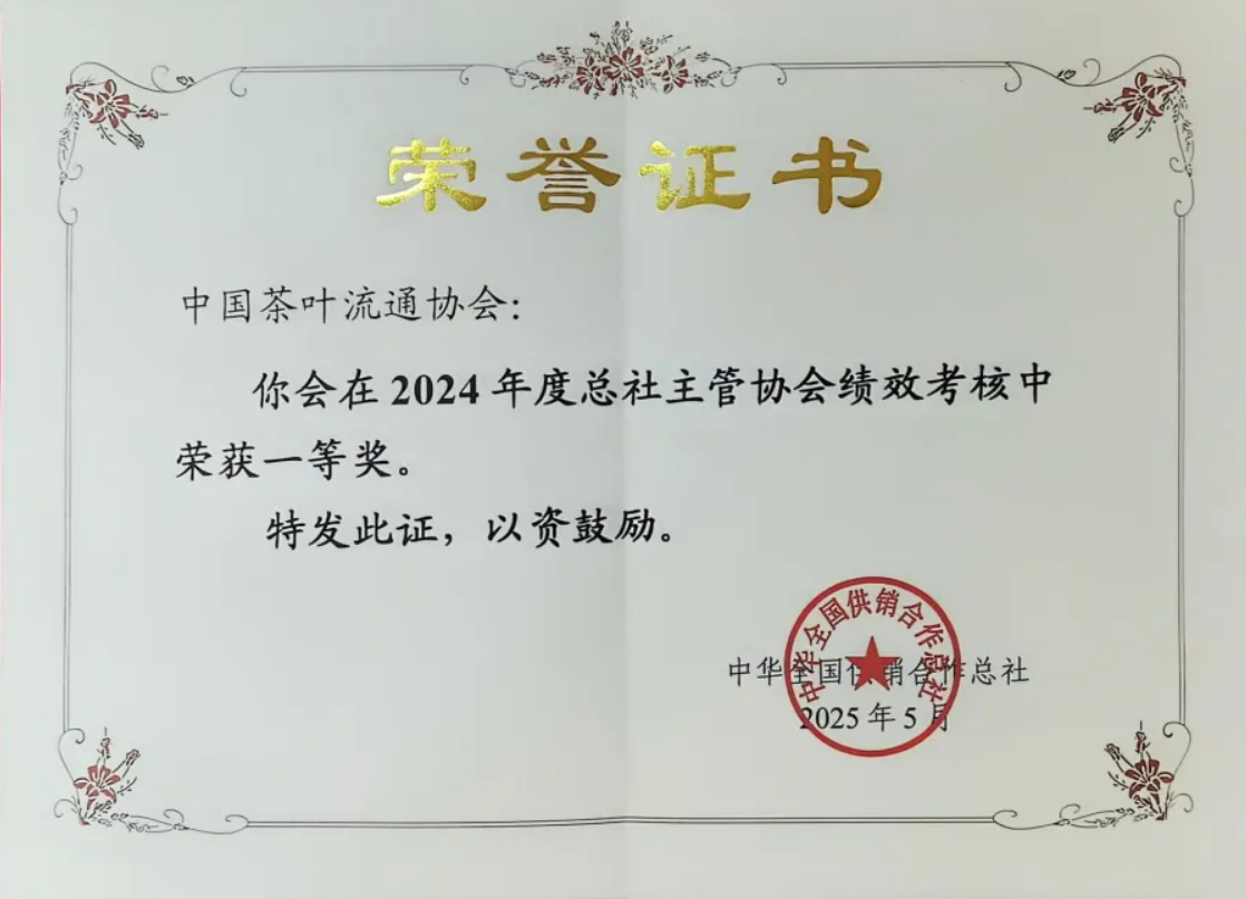 2024年,中国茶叶流通协会在总社党组、理事会的坚强领导下,始终以习近平新时代中国特色社会主义思想为指导,全方位推进各项工作。协会紧密围绕“国茶振兴·五年计划”文旅振兴年的总体目标要求,以国家“5A”社会组织标准为核心驱动力,扎实筑牢党建根基,积极创新管理机制,推动行业转型升级,持续提升协会的服务能力和行业影响力。经总社对主管协会2024年度工作绩效进行考核,中国茶叶流通协会荣获2024年度主管协会绩效考核唯一的一等奖。