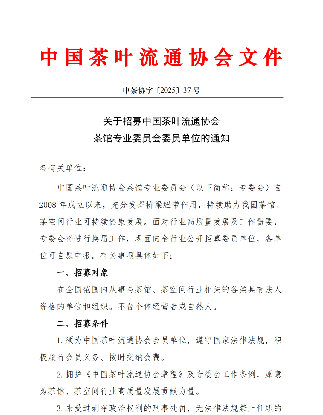 关于招募中国茶叶流通协会茶馆专业委员会委员单位的通知