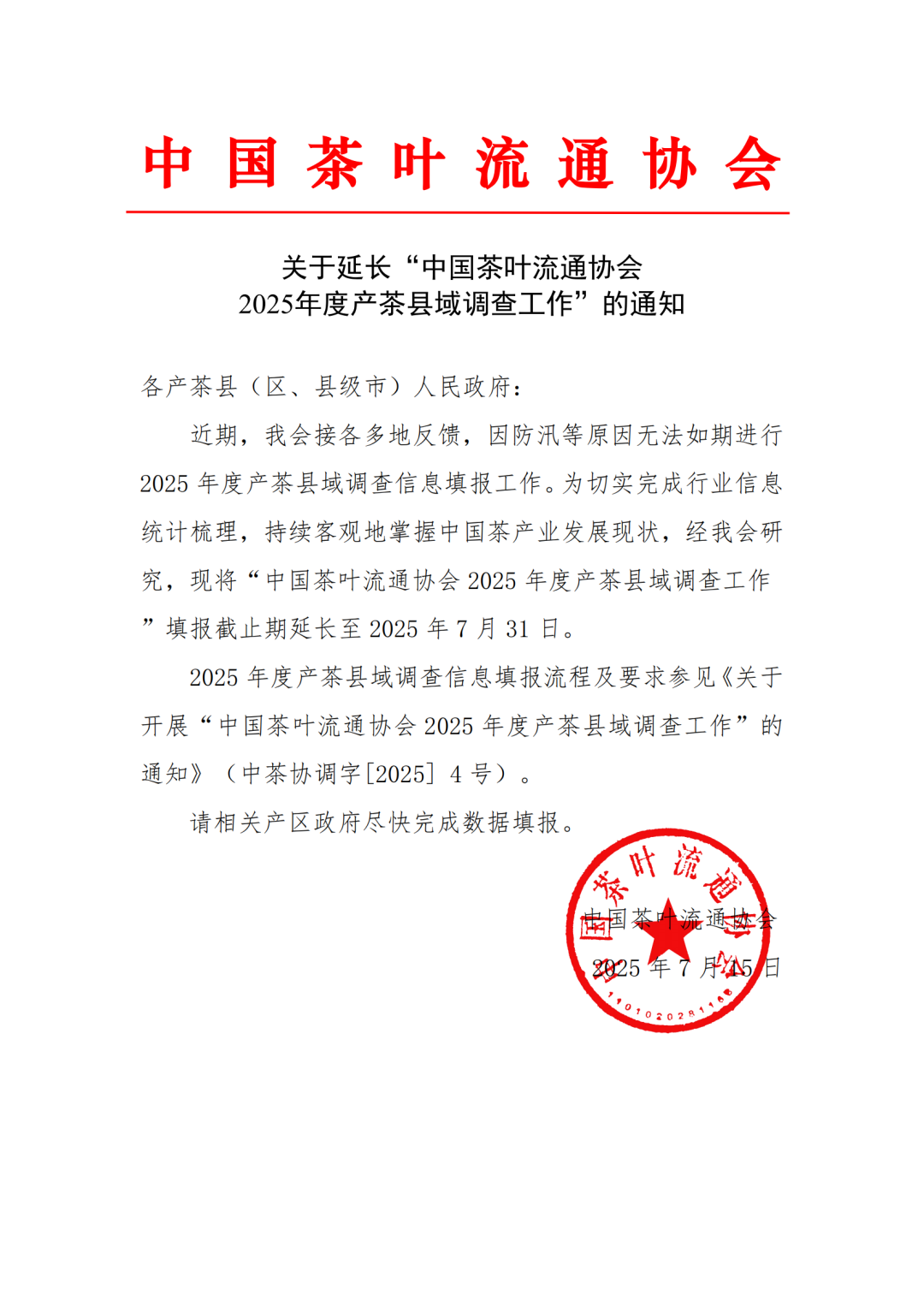 关于延长“中国茶叶流通协会2025年度产茶县域调查工作”的通知