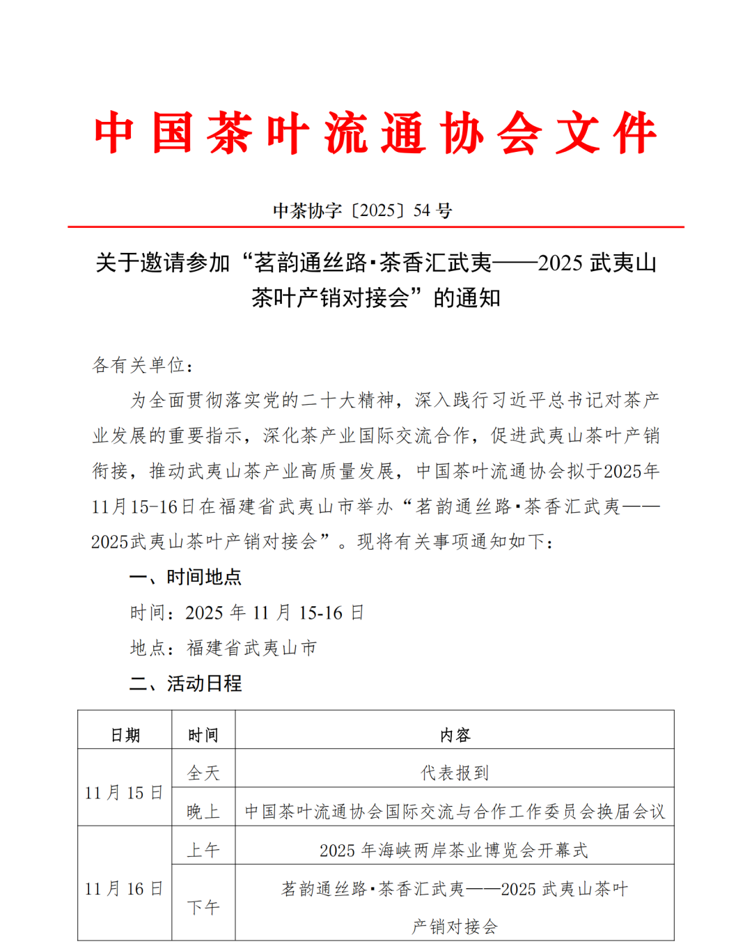 关于邀请参加“茗韵通丝路·茶香汇武夷——2025武夷山茶叶产销对接会”的通知