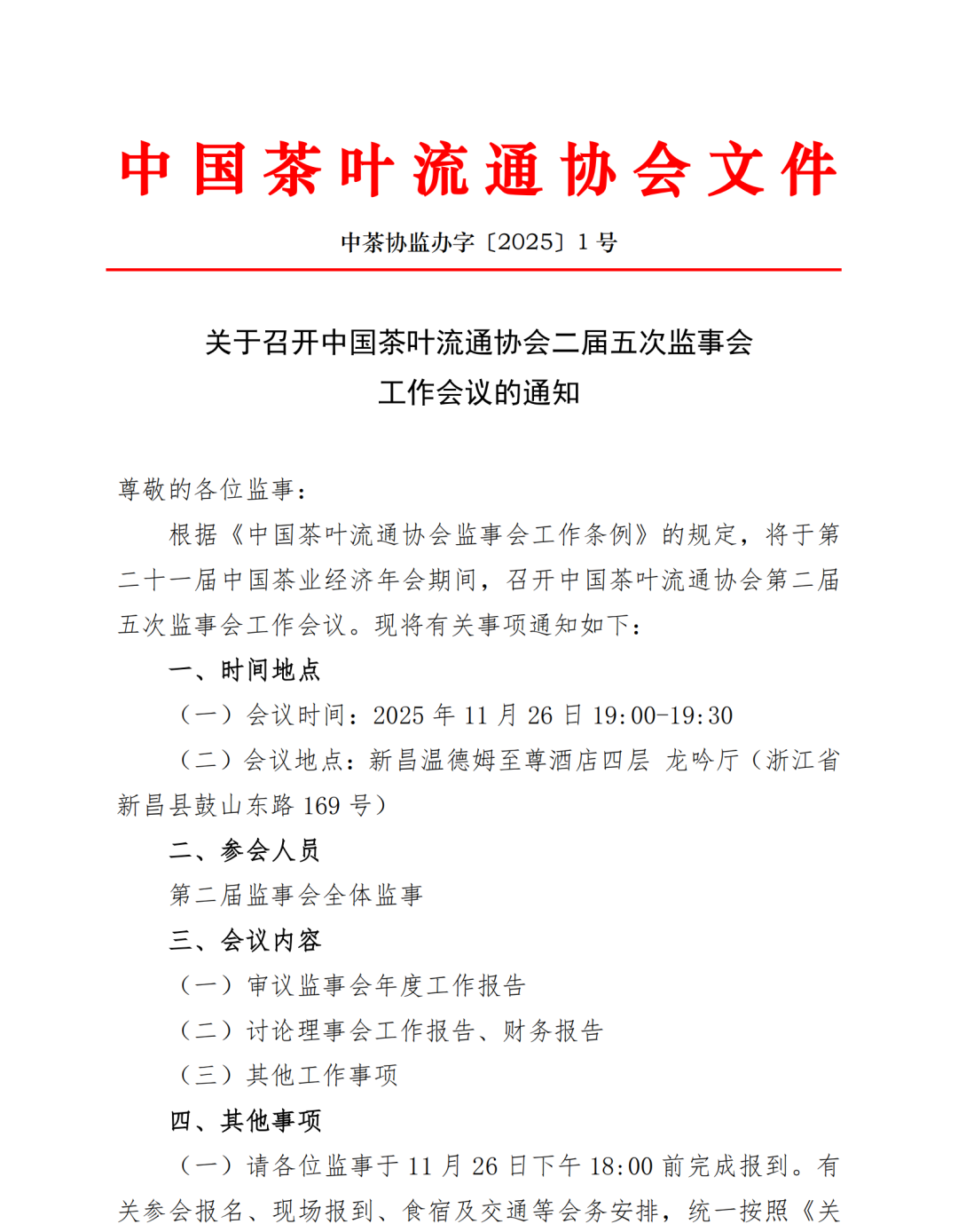 关于召开中国茶叶流通协会二届五次监事会工作会议的通知