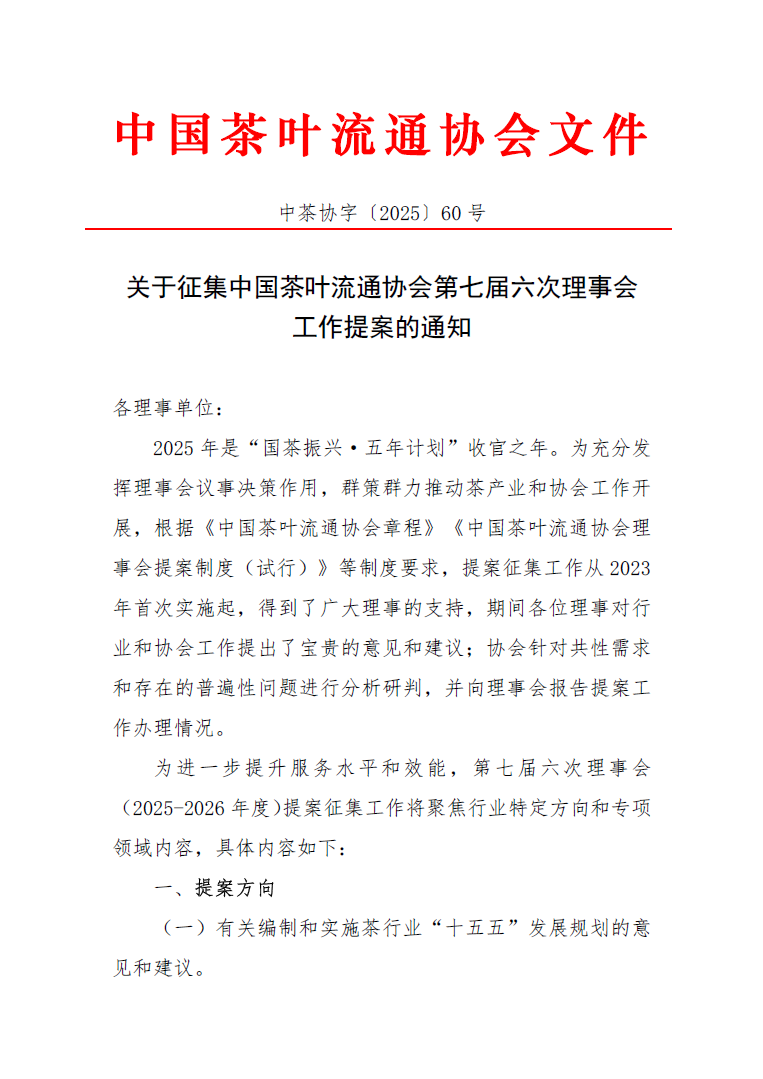 关于征集中国茶叶流通协会第七届六次理事会工作提案的通知
