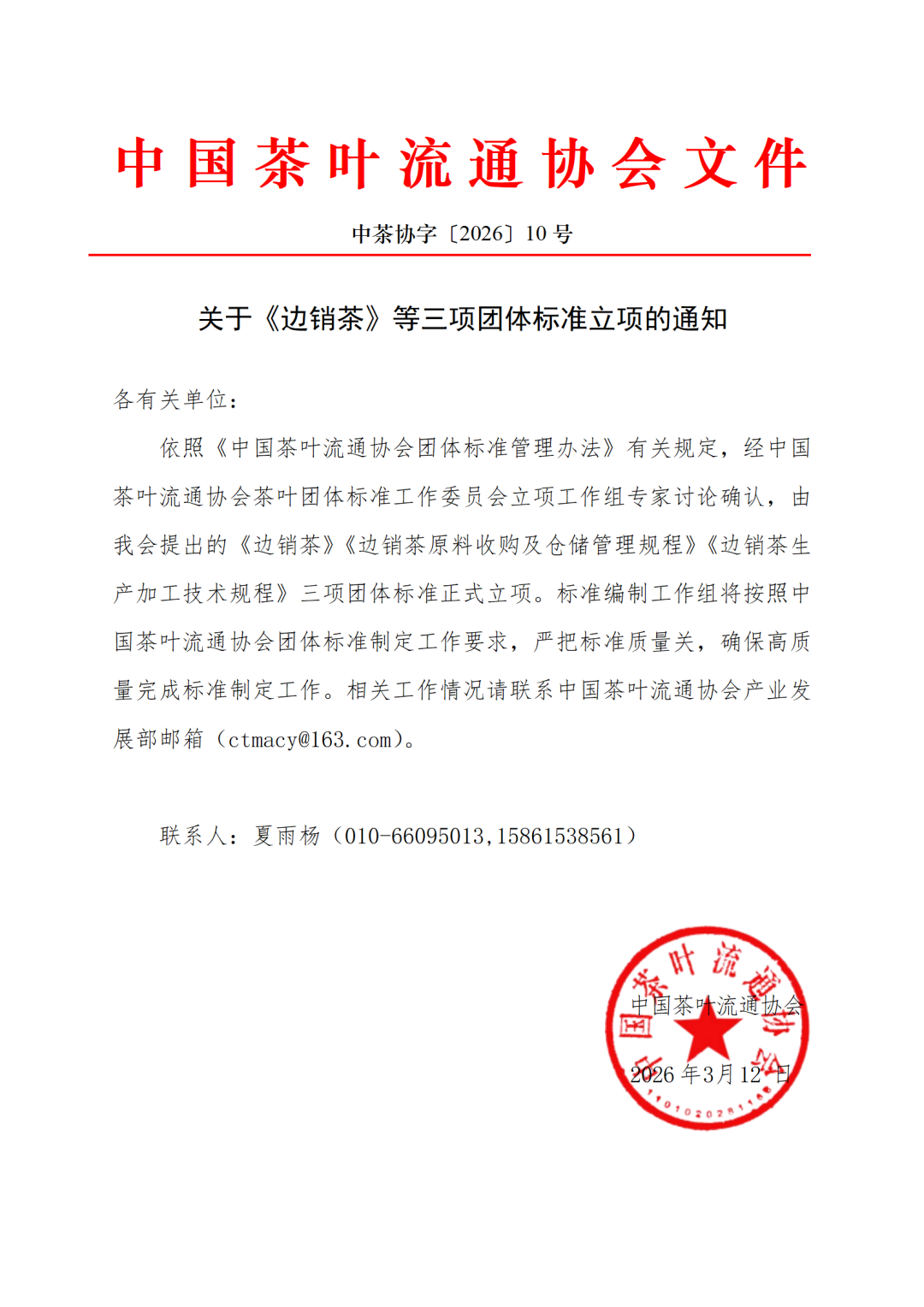 关于《边销茶》等三项团体标准立项的通知