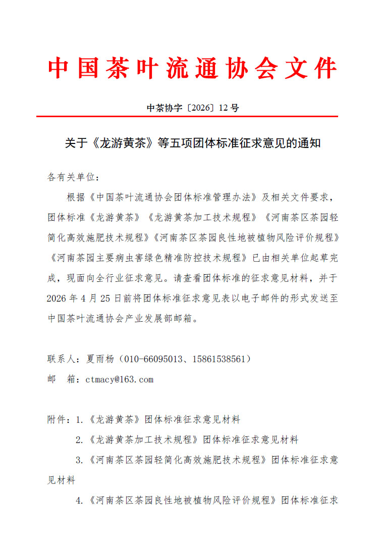 关于《龙游黄茶》等五项团体标准征求意见的通知