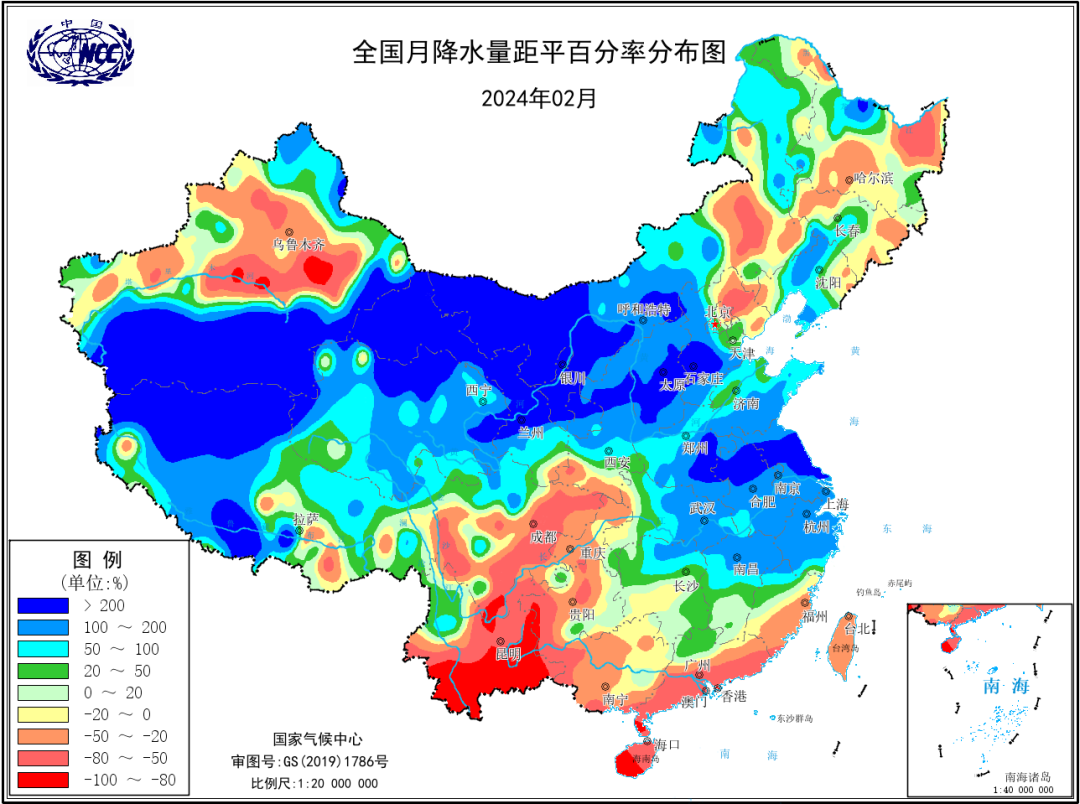 2024年2月全国降水量距平百分率分布图(单位:%)
